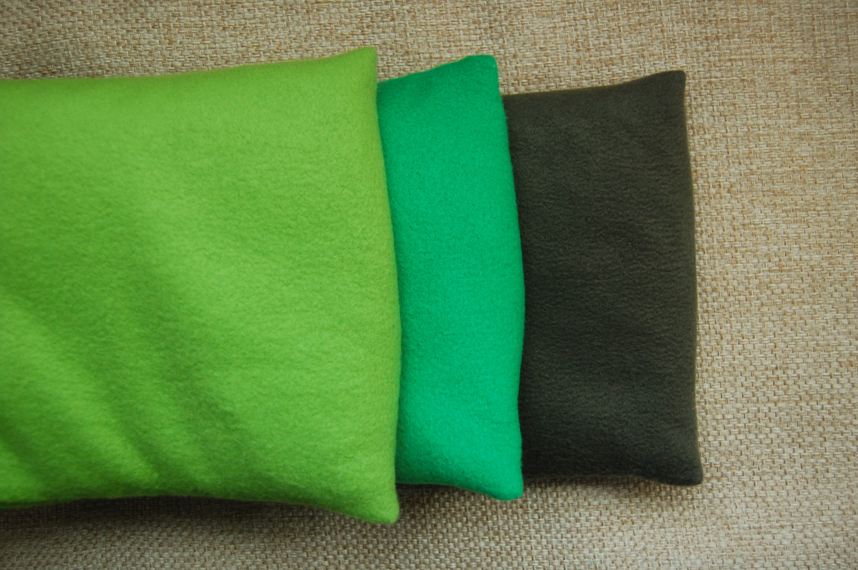 Fleece is plush and fuzzy. It diffuses the temperature and insulates the corn bag, keeping it warmer (or cooler) for longer than flannel. Fleece is 100% polyester.